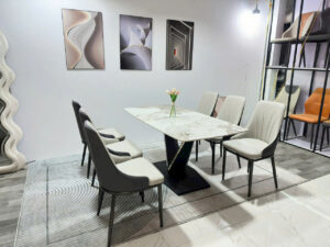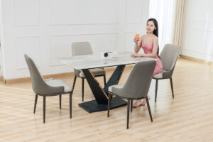 Để trọn bộ hoàn hảo, dàn ghế đi kèm được thiết kế dầy dặn, bền bỉ, đảm bảo sự thoải mái trong từng bữa cơm. Màu sắc hiện đại của bộ bàn ghế dễ dàng hòa hợp với mọi phong cách nội thất từ chung cư đến nhà phố.
